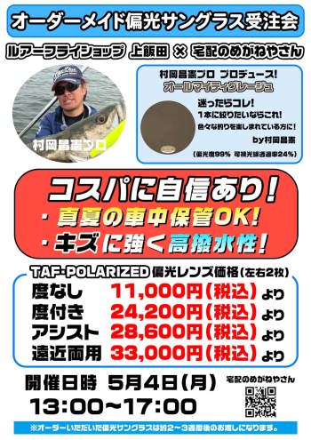 | 【オーダーメイドサングラス受注会お問合せ】 ルアーフライショップ上飯田 TEL:052-912-6791 FAX:052-915-2766 e-mail:kamiiida@abelia.ocn.ne.jp |